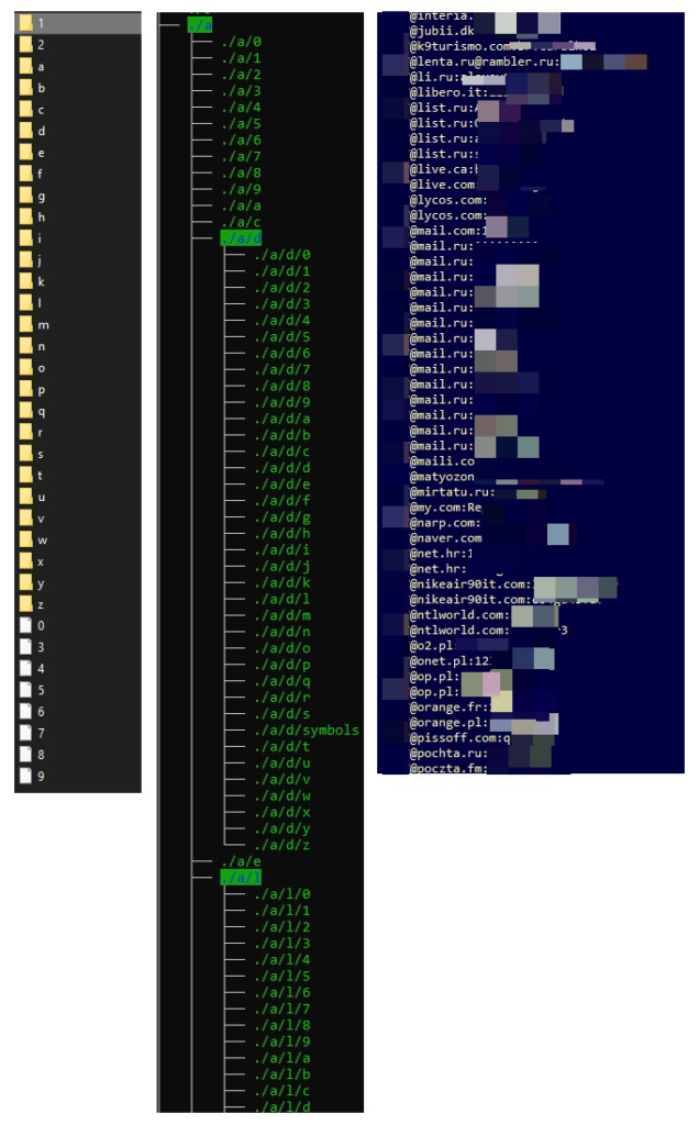 به نظر نمیرسد که این درز اطلاعات شامل موارد جدیدی بشود اما بزرگترین مجموعه گردآوری شده اطلاعات میباشد. تقریبا همانند نشت اطلاعاتی سال 2017، اطلاعات COMB بر اساس حروف الفبا مرتب شده و بصورت درختی شکل یافتهاند که شامل اسکریپهای یکسانی برای ایمیلها و پسوردها میشود. در تصویر زیر میتوان اطلاعات منتشر شده و ساختار انتشار آن را مشاهده نمود که توسط سایبرنیوز محو شده است.